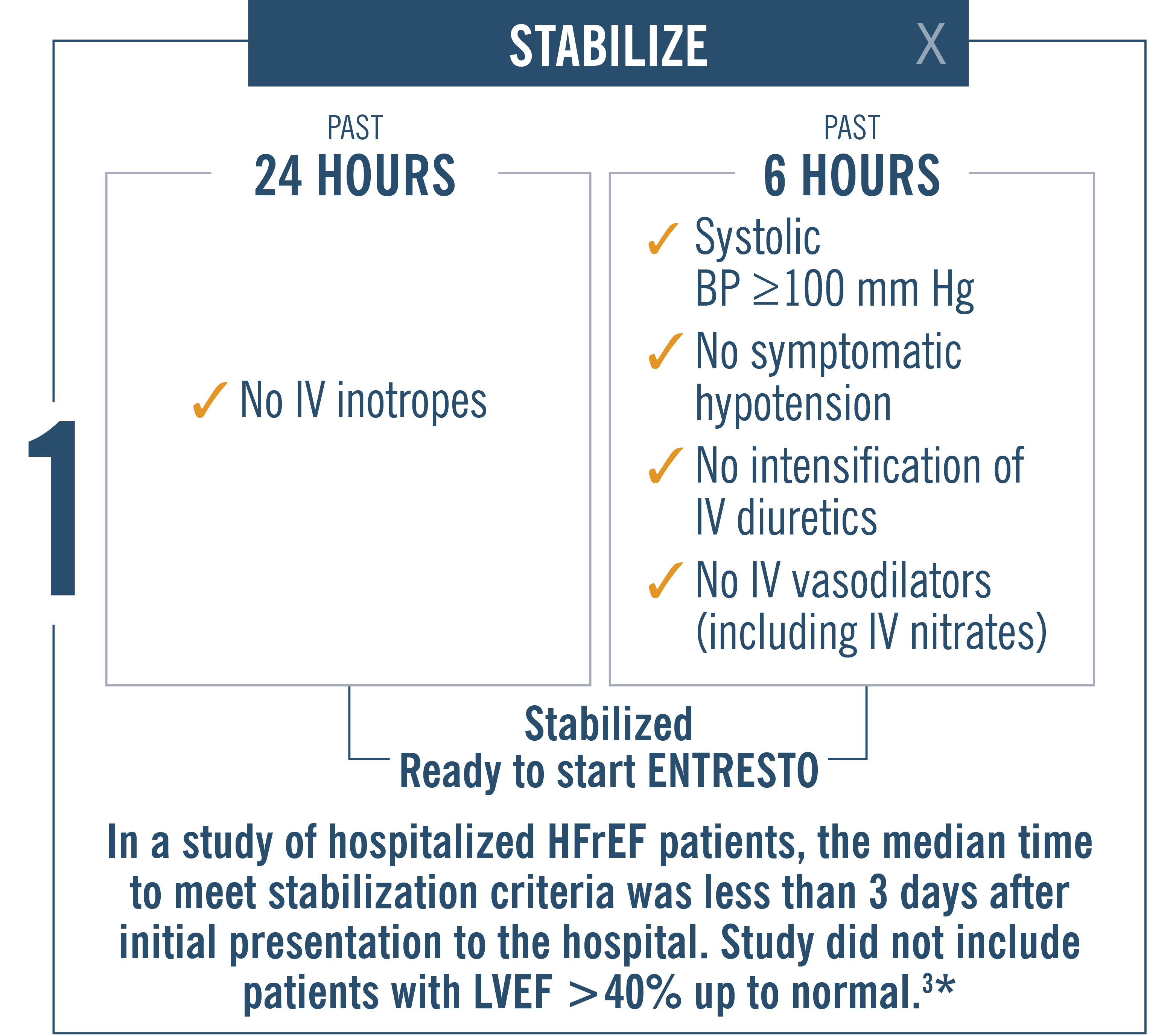 References: 1. ENTRESTO [prescribing information]. East Hanover, NJ: Novartis Pharmaceuticals Corp; February 2021. 2. Yancy CW, Jessup M, Bozkurt B, et al. 2017 ACC/AHA/HFSA focused update of the 2013 ACCF/AHA guideline for the management of heart failure: a report of the American College of Cardiology/American Heart Association Task Force on Clinical Practice Guidelines and the Heart Failure Society of America. Circulation. 2017;136(6):e137-e161. 3. Velazquez EJ, Morrow DA, DeVore AD, et al; for the PIONEER-HF Investigators. Angiotensin–neprilysin inhibition in acute decompensated heart failure. N Engl J Med. 2019;380(6):539-548. 4. Senni M, McMurray JJV, Wachter R, et al. Initiating sacubitril/valsartan (LCZ696) in heart failure: results of TITRATION, a double-blind, randomised comparison of two uptitration regimens. Eur J Heart Fail. 2016;18(9)(suppl):1193-1202. doi:10.1002/ejhf.548. Accessed January 4, 2021. Supplementary material accessed at https://onlinelibrary.wiley.com/action/downloadSupplement?doi=10.1002%2Fejhf.548&file=ejhf548-sup-0001-AppendixS1.doc